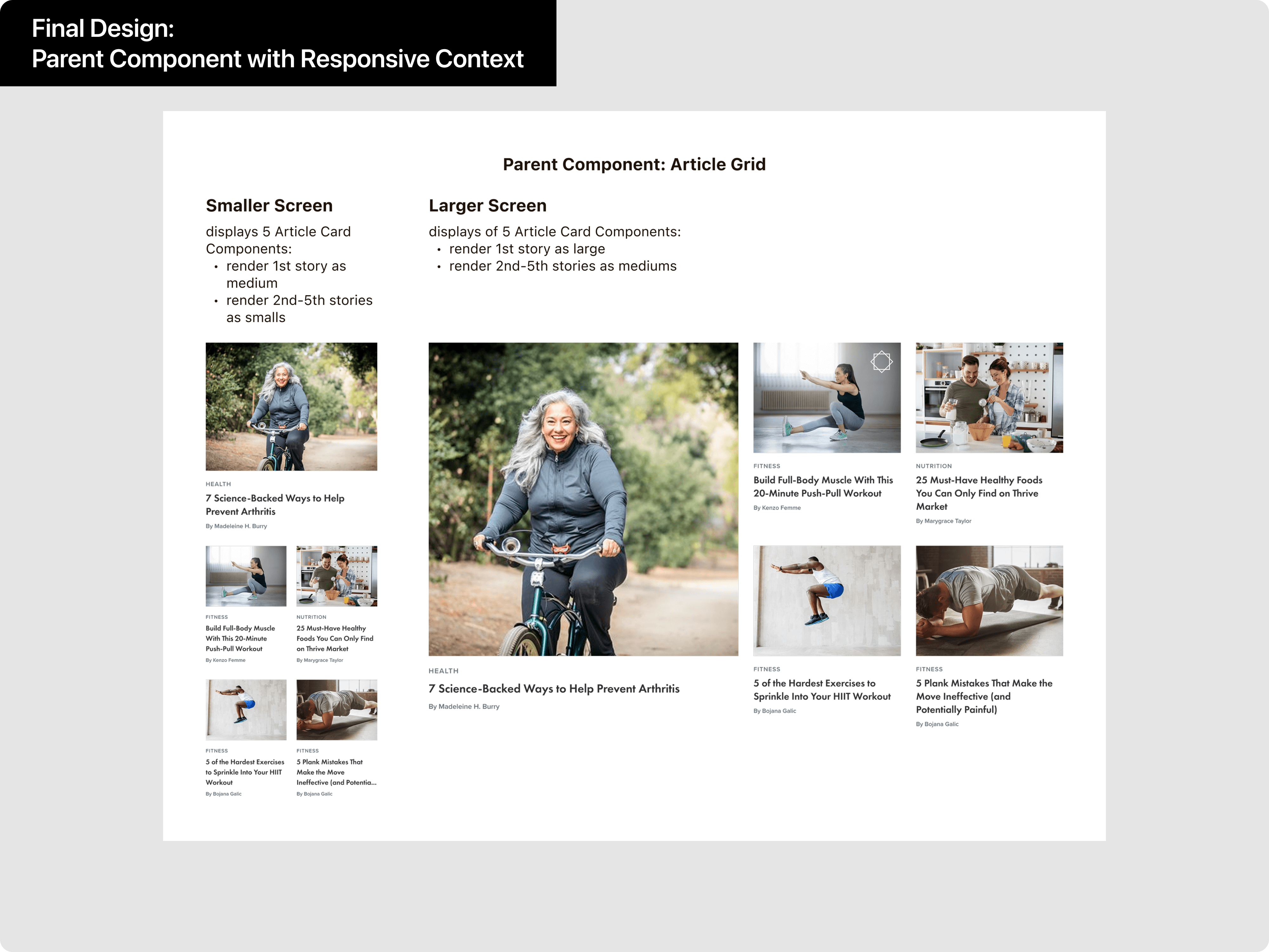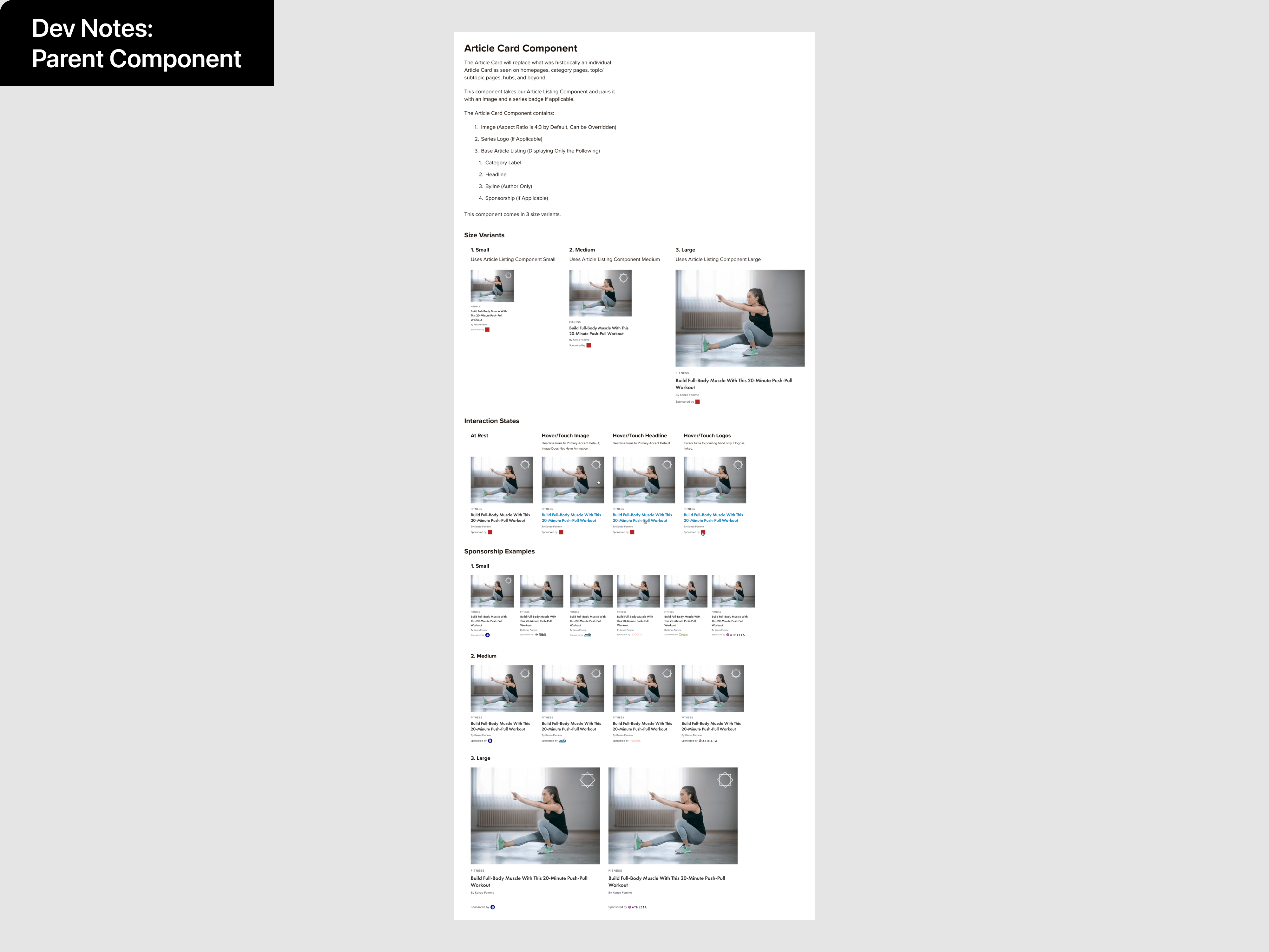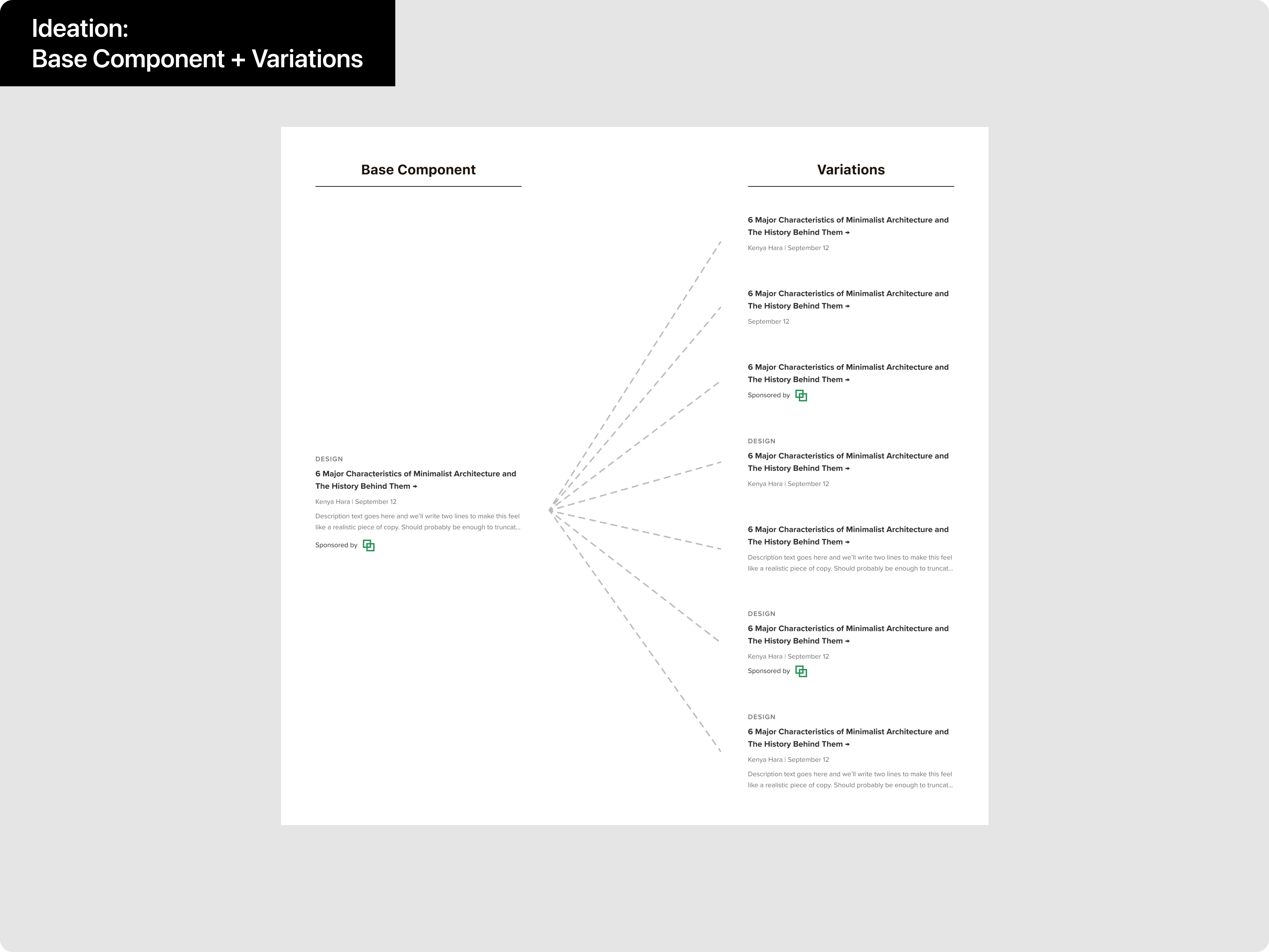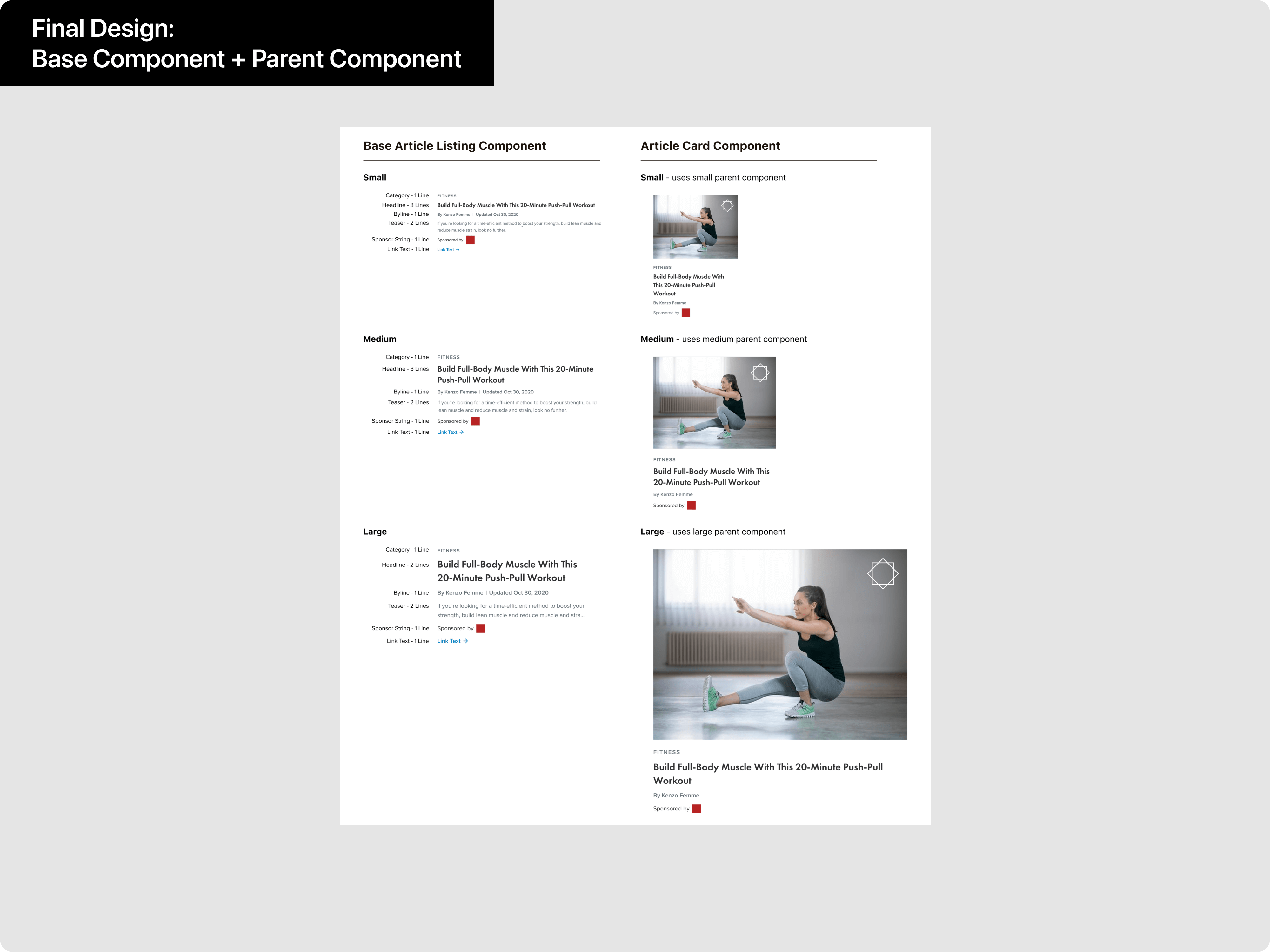 Leaf Group owns and operates numerous media brands each with their own site design and implementation. As part of this project, the different variations of article cards within each site and across Leaf Group's numerous web properties become standardized under a new centralized and customizable component implementation.